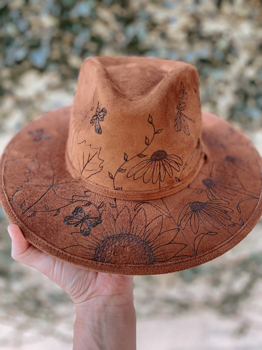 “Sunflower Dreams” – Light Tan Boho Fedora with Hand-Drawn Florals