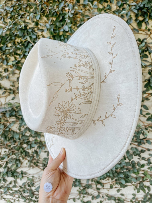 “The Wild Grace Fedora” – Hand-Drawn Ivory Fedora with Wildflowers