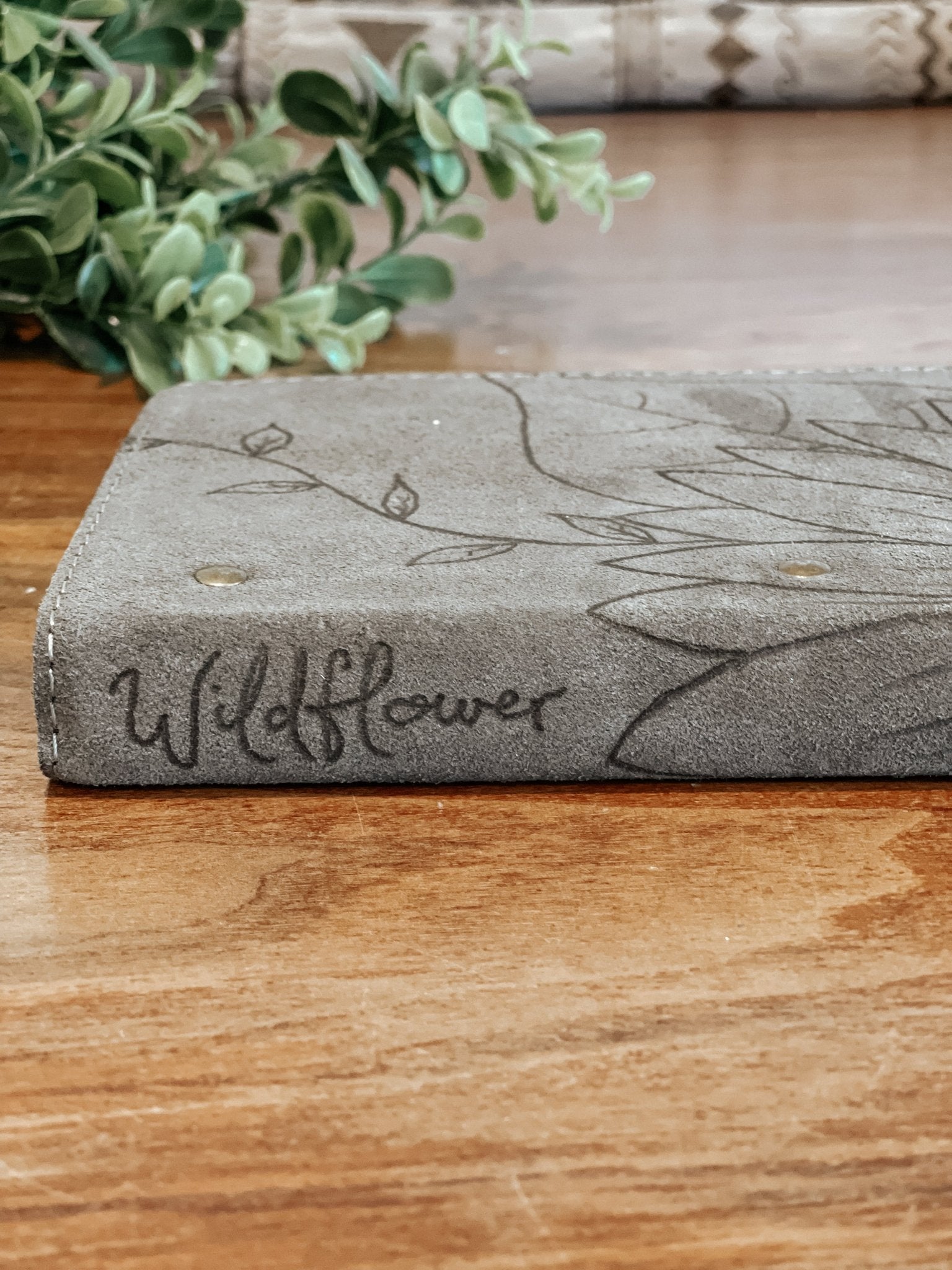 Let your thoughts unfurl like petals with this gray faux suede journal, hand-burned with a blooming sunflower that wraps around its cover. Each line of this botanical notebook invites slow living, sacred reflection, and the kind of quiet magic only found in sun-drenched fields