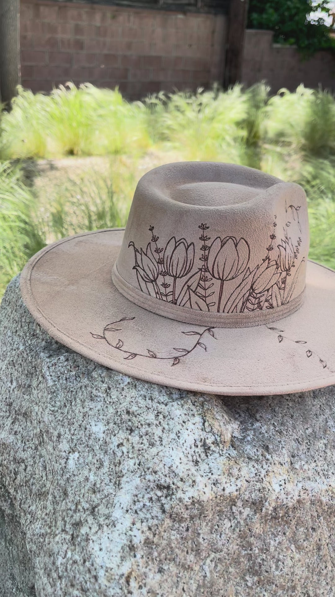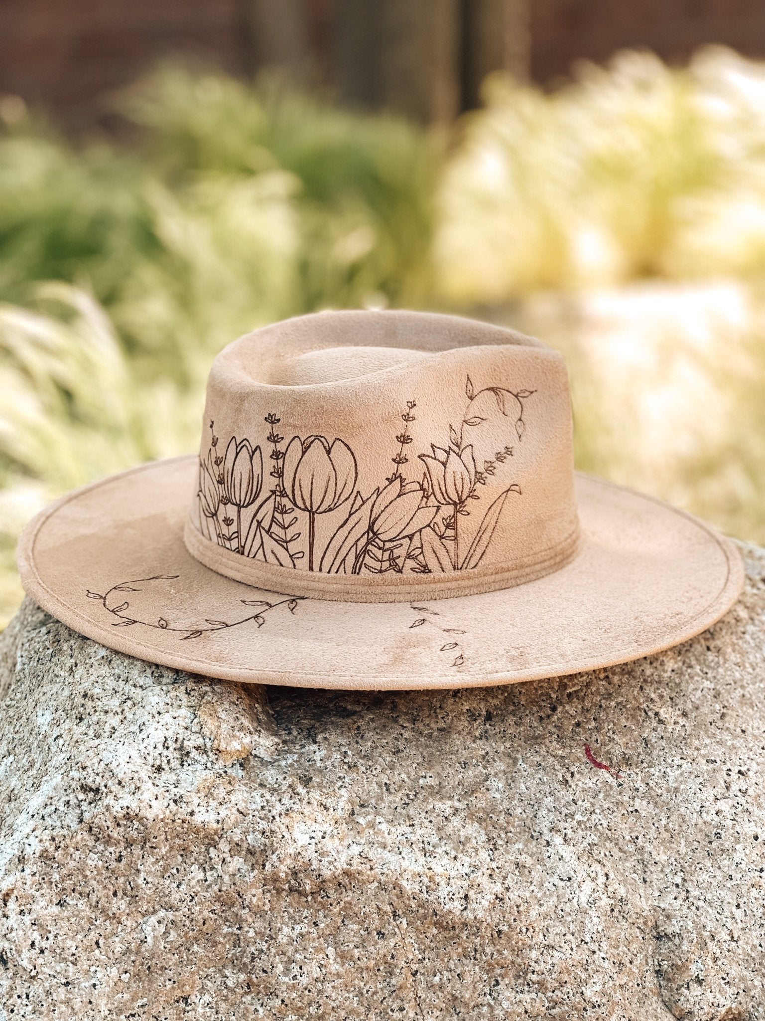 “Tulip Fields” is a celebration of nature’s elegance in its most delicate form. Hand-drawn tulips and lavender are gently illustrated on a soft fedora, creating a design that speaks softly yet beautifully.