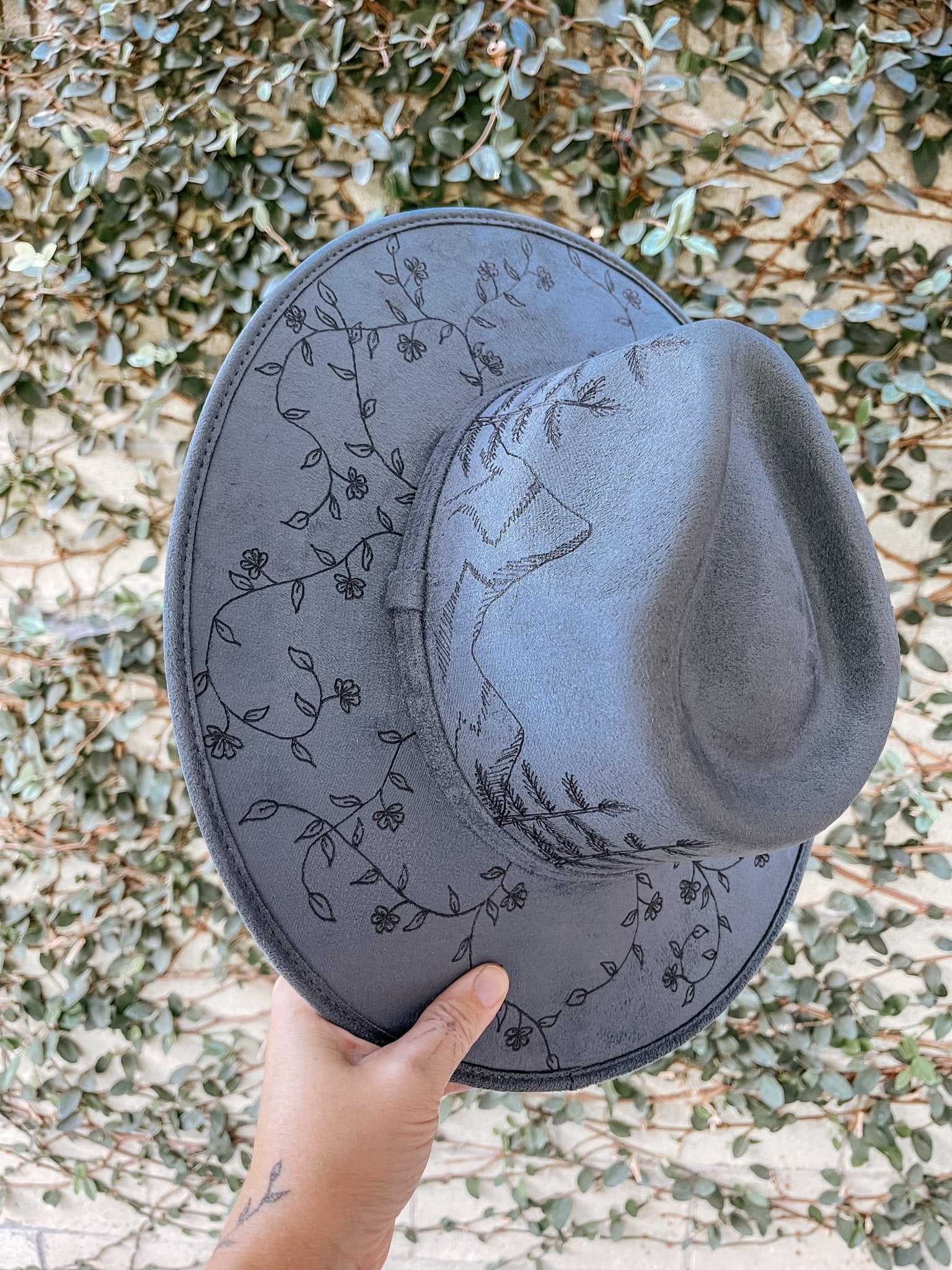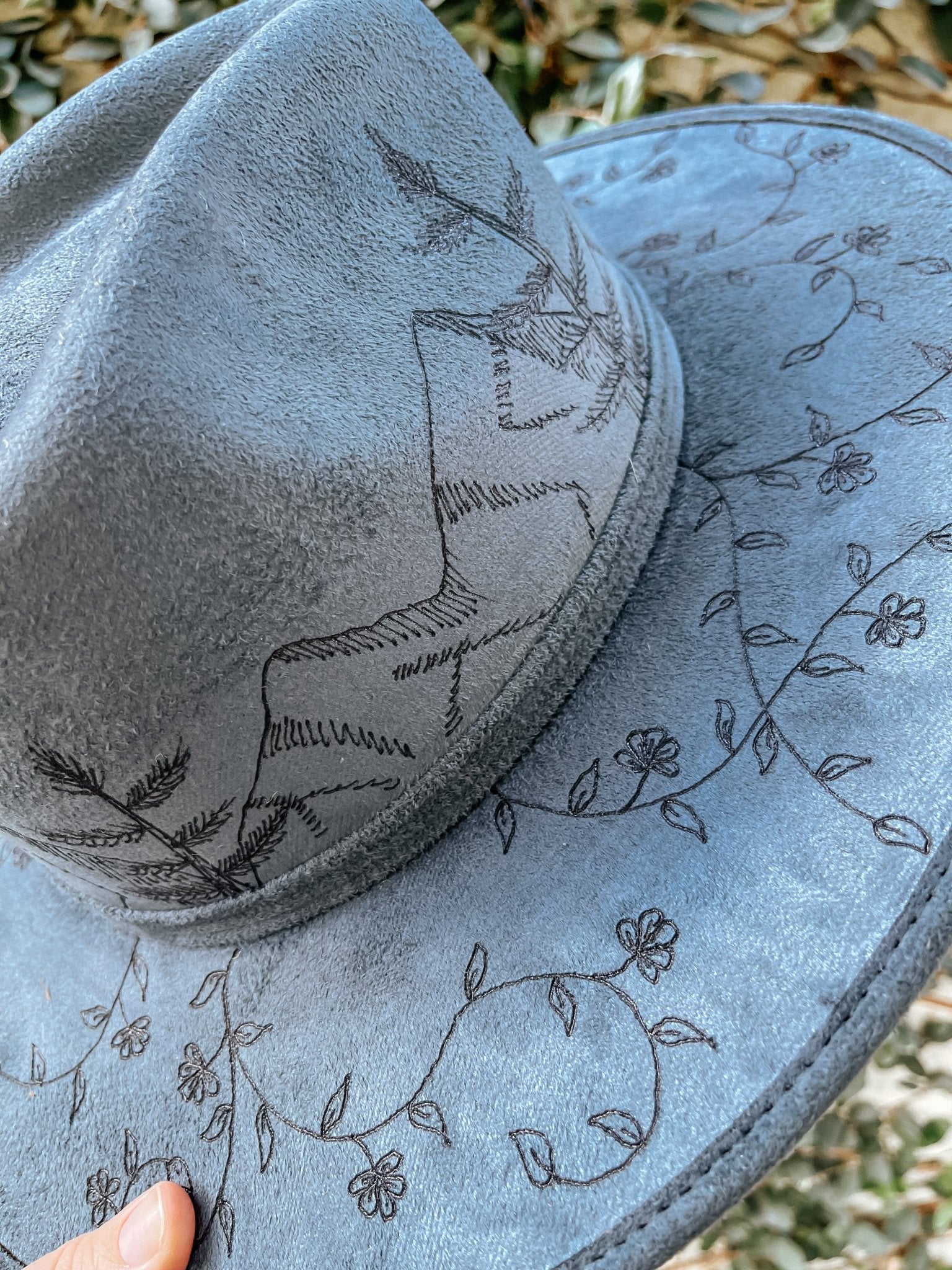 Each hat is carefully illustrated/burned by hand, blending art and craftsmanship into a wearable landscape that celebrates freedom, strength, and connection to nature. The soft, denim-toned polyester suede offers a relaxed yet refined feel, making it easy to pair with everything from flowing dresses to rugged denim jackets.