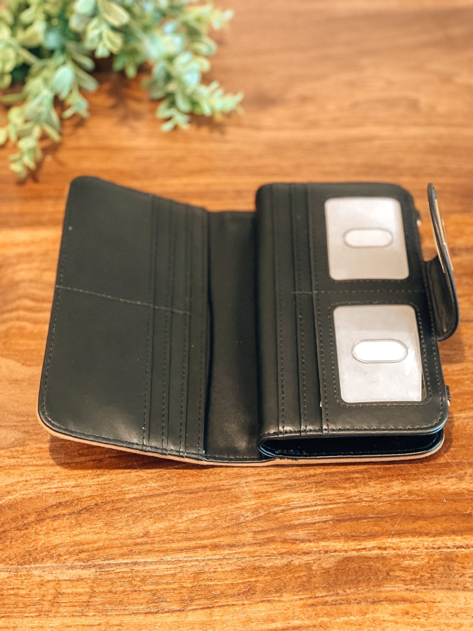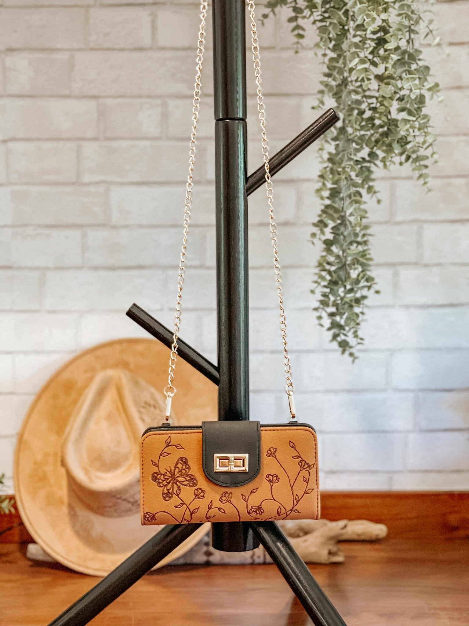 Hand-drawn wildflowers and monarch butterflies cover the soft tan exterior of this piece, wrapping the purse in gentle movement and natural beauty. With a removable gold chain, it easily transitions from wallet to clutch to crossbody — designed to carry your essentials and your story.